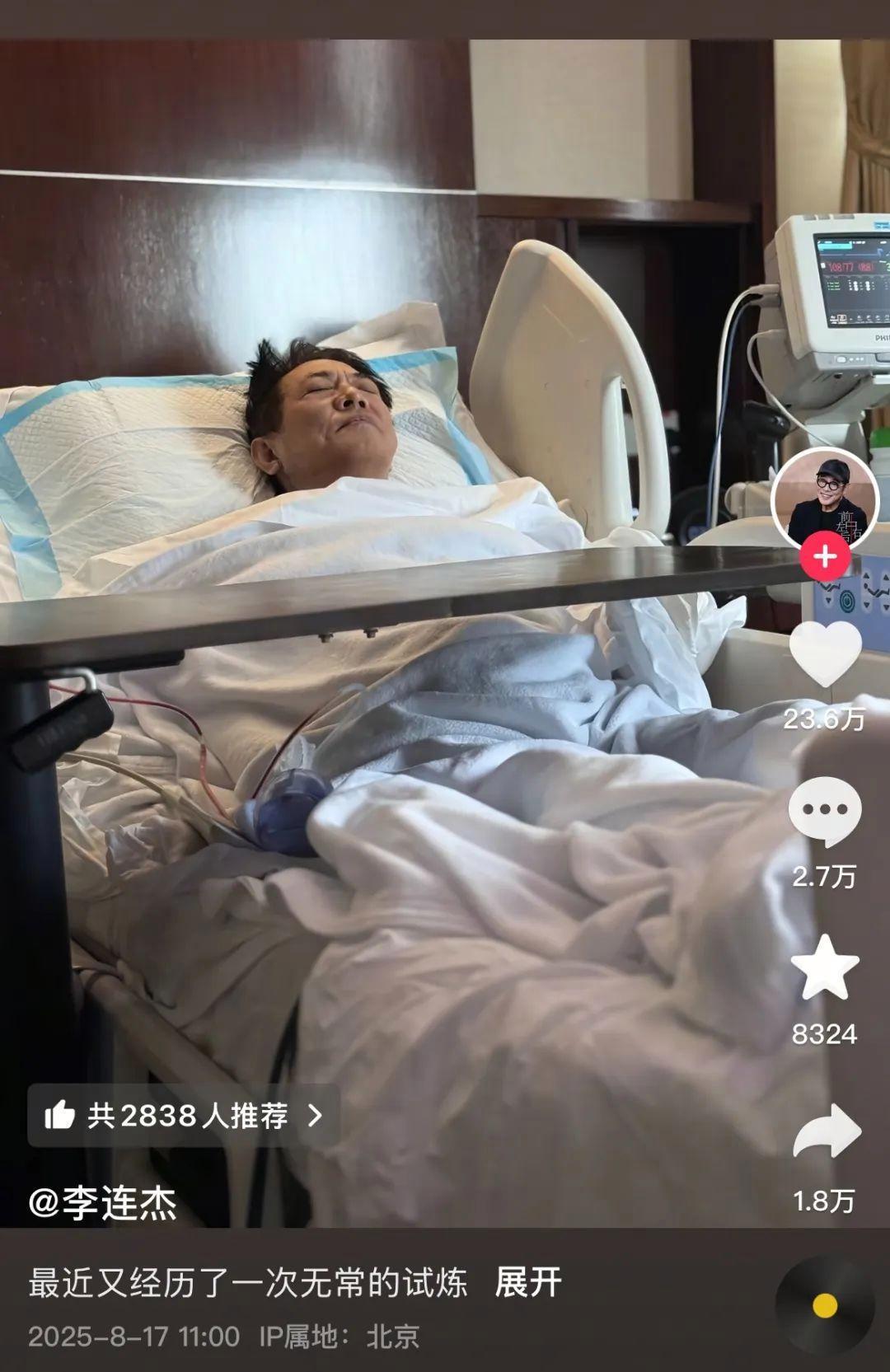 此前,8月17日,李连杰在社交账号上发布自己躺在病床上的照片,配文称“最近又经历了一次无常的试炼。”李连杰幽默回应称“硬件出了点问题,返厂维修一下。”